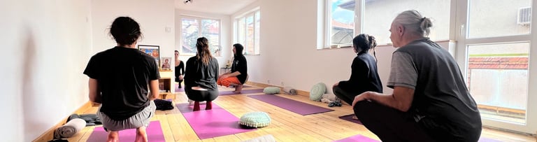 Each class begins with a short meditation/relaxation to come to the present moment, followed by a warm-up (joint movements, self massage, sun salutations), then a combination of exercise postures and breathing specific to the topic to end with relaxation and meditation.